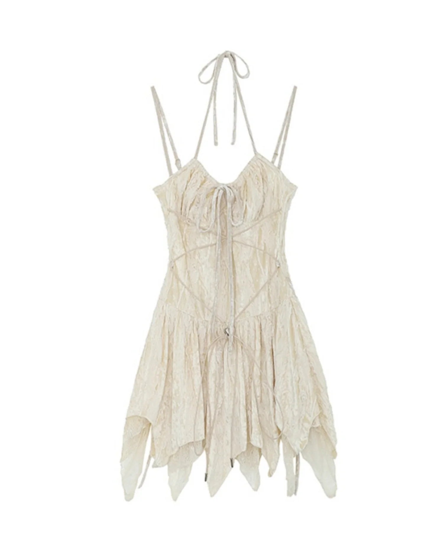 Soft velvet mini dress in ivory , with delicate lace details and an asymmetrical hem. It features adjustable straps and a subtle front bow for a flattering fit and a romantic touch.