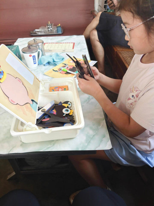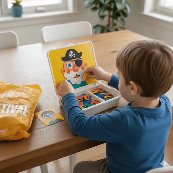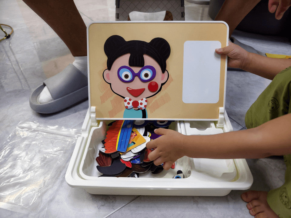 A mi hijo le encanta crear caras divertidas. Lo mantiene entretenido durante mucho tiempo sin necesidad de pantallas.